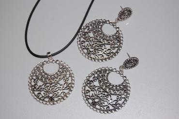 Original y fabuloso conjunto a juego de collar y pendientes, de bellísimo diseño en tonos plata envejecida y negro, ideal tanto para regalar y como para lucir en todas tus ocasiones.